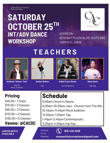 Phone: +1.8134103215 Email: craneartisticcreations@gmail.com Instagram: @cacdanceco